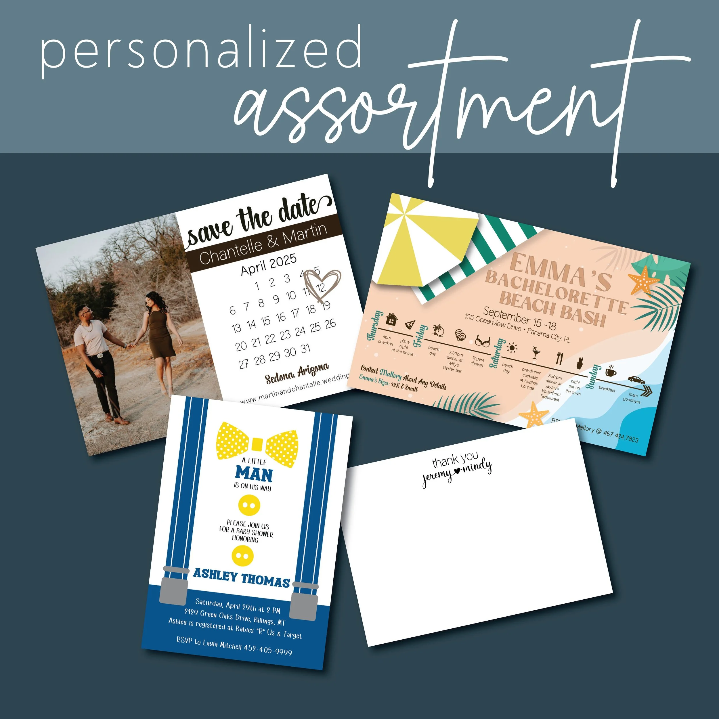 Explore a collection of our custom invitations, thoughtfully designed for life’s celebrations. From weddings and birthdays to baby showers and beyond, each piece is created with care to set the tone and make your event feel truly special.